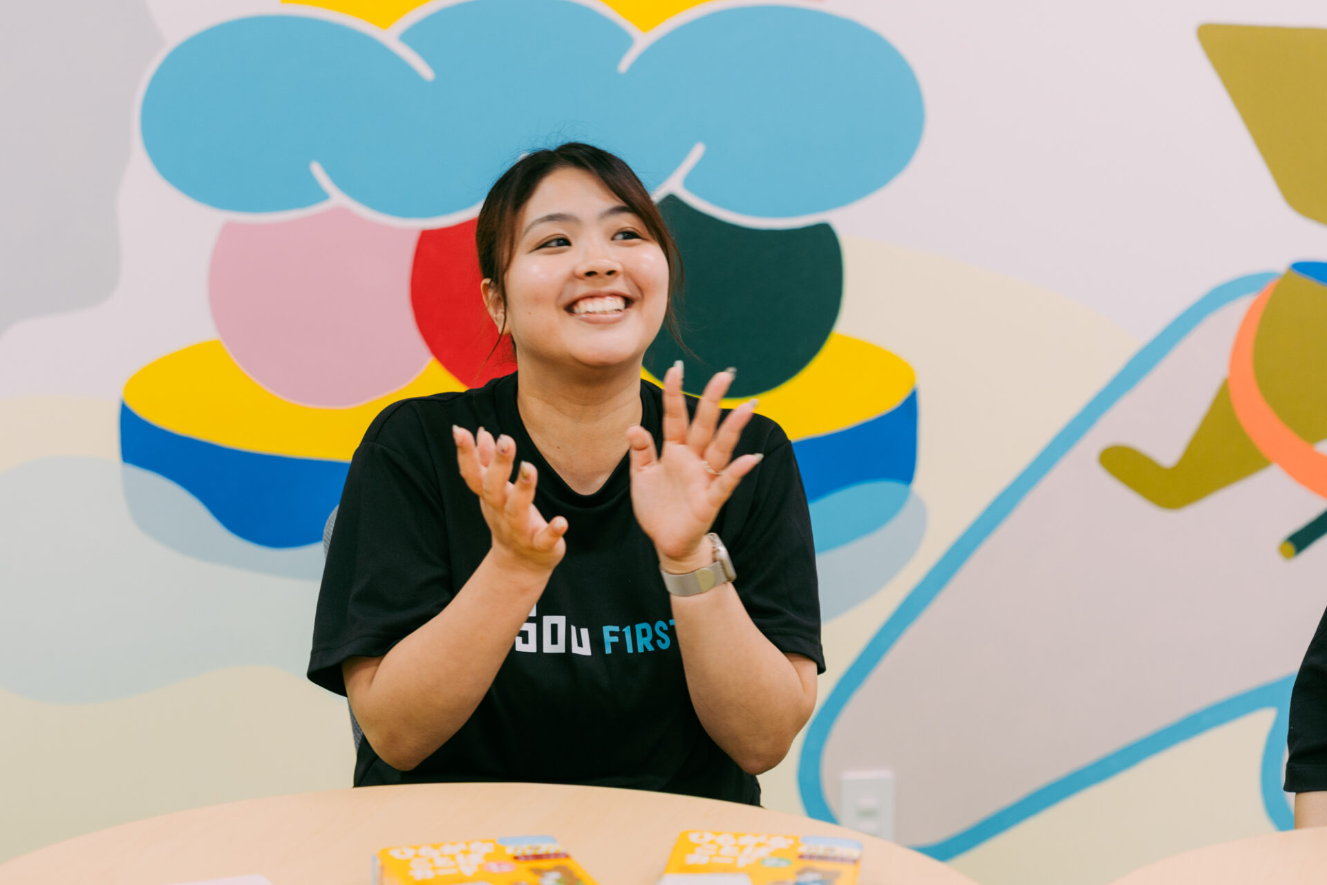 SOU FIRST高原でSTをしています、大城依沙音です。新卒でリハビリ病院に就職して、2年ほど勤務したあとに児童分野へ転職しました。もともと小児に行きたい気持ちがあったので、就職活動をして今に至ります。